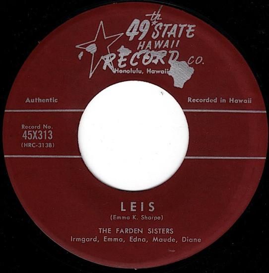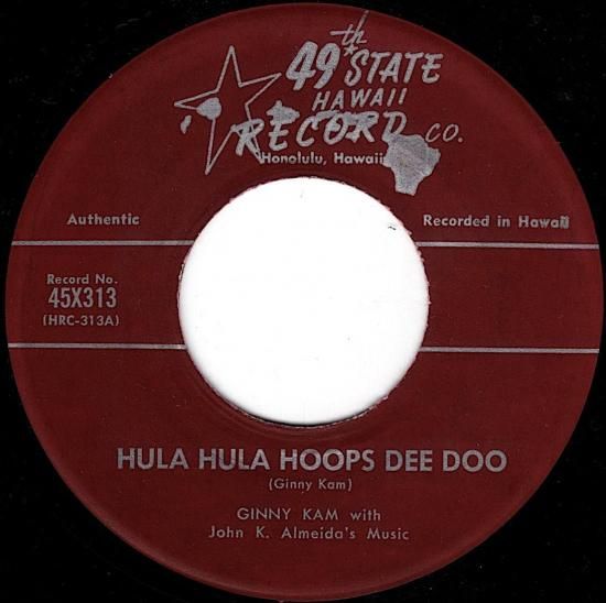 45 RPM Side A Hula Hula Hoops Dee Doo Ginny Kam with John K Almeida`a Music Side B Leis The Farden Sisters Irmgard, Emma, Edna, Maude, Diane ■49th State Hawaii Record Co. |