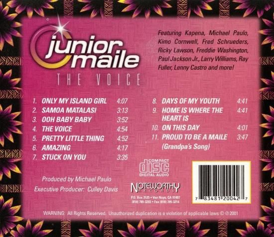 01.Only My Island Girl - 4:07 02.Samoa Matalasi - 3:13 03.Ooh Baby Baby - 3:52 04.The Voice - 4:54 05.Pretty Little Thing - 4:52 06.Amazing - 4:17 07.Stuck On You - 3:35 08.Days Of My Youth - 4:41 09.Home Is Where The Heart Is - 4:41 10.On This Day - 4:01 11.Proud To Be A Maile (Grandpa`s Song) - 3:47 ★`Ukulele Island Contemporary 歌詞カードつき 2001Noteworthy Records .Junior Maile: lead & background vocals .Michael Paulo: background vocals, keyboards, sythsizers .Will Weaton: background vocals .Terry Bredford: background vocals .Fred White: background vocals .Johnny Britt: background vocals, keyboards, sythsizers .Kelly Boy: background vocals, `ukulele .Ray Fuller: guitar .Allen Hinds: guitar .Fred Schreuders: guitar, `ukulele .Paul Jackson Jr.: guitar .Freddie Washington: bass, keyboards, sythsizers .Andrew Ford: bass .Rickey Lawson: drums .Land Richards: drums .Sergio Gonzales: drums .Lenny Castro: percussion .Raphael Padilla: percussion .Brian Simpson: piano .Kimo Cornwell: piano, keyboards, sythsizers .Ron King: trumpet .Ira Nepus: trombone 最近チェックした商品