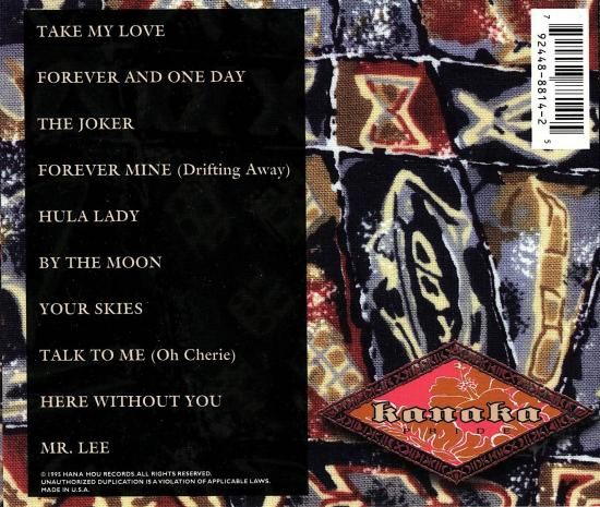 01.Take My Love 02.Forever And One Day 03.The Joker 04.Forever Mine 05.Hula Lady 06.By The Moon 07.Your Skies 08.Talk To Me 09.Here Without You 10.Mr. Lee ★Contemporary 歌詞カードつき 1995Hana Hou Records ◆Kanaka Pride: .Jack Viohl, Jr: lead vocals .Jerry K. Jona, Jr: guitar, vocals .Benjamin V. Taaca: guitar, vocals ■Addtional Musicians: .Keith Barrowns: bass .Jason Gordon: percussion .Bobby Furgo: keyboards |